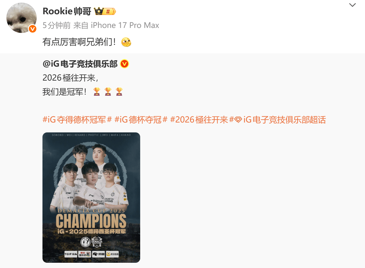 虎撲01月03日訊 iG贏下2025德瑪西亞杯,賽后Rookie發(fā)文祝賀iG奪冠: