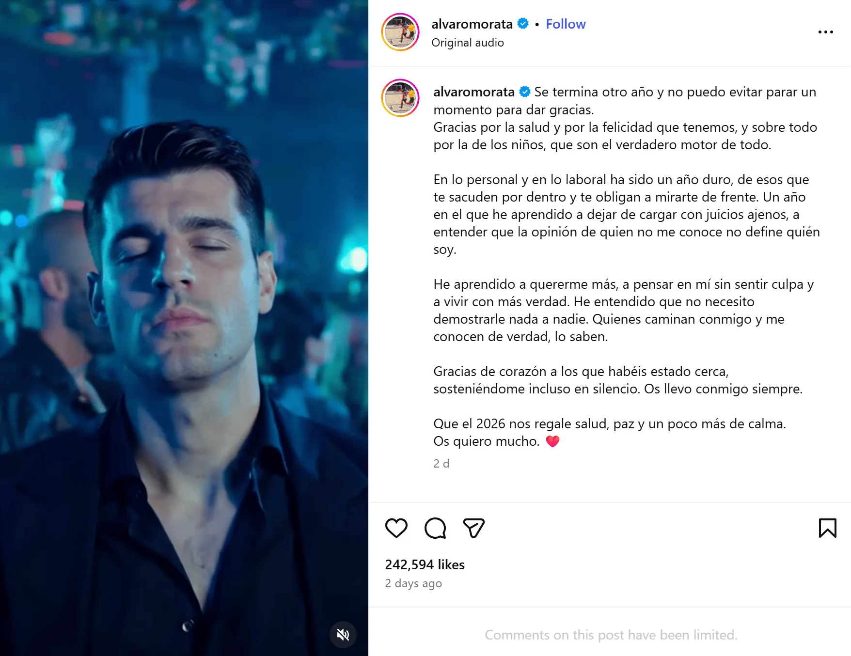 對(duì)于莫拉塔而言,剛剛過(guò)去的2025年可謂波折不斷。這一年他經(jīng)歷了與妻子愛(ài)麗絲的復(fù)合,離開(kāi)了加拉塔薩雷加盟科莫,同時(shí)作為西班牙國(guó)家隊(duì)主力前鋒也承受了諸多輿論壓力。然而,這段備受關(guān)注的感情似乎并未隨著新年的到來(lái)而平穩(wěn),兩人在2026年伊始發(fā)布的社交動(dòng)態(tài)顯示,他們的關(guān)系再次陷入了巨大的困境。